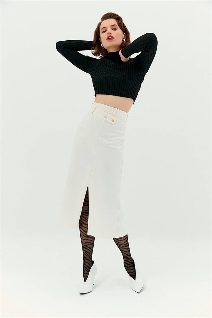 Ekru Asimetrik Bel Detaylı Midi Etek