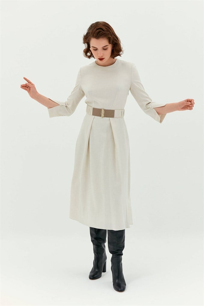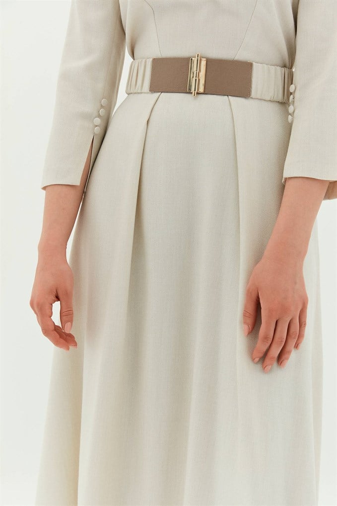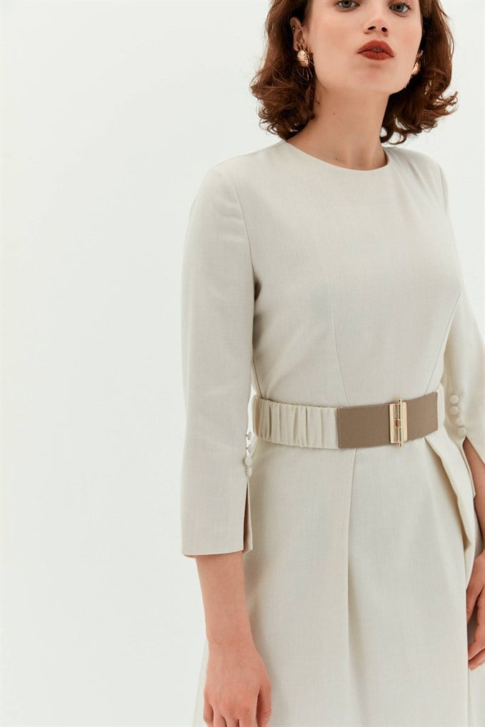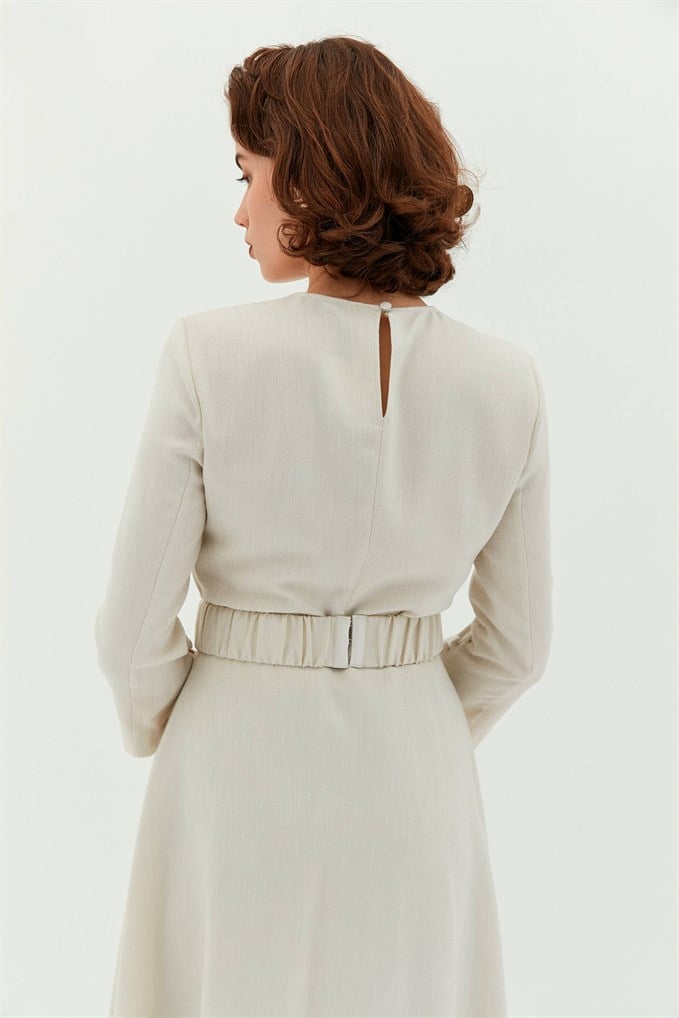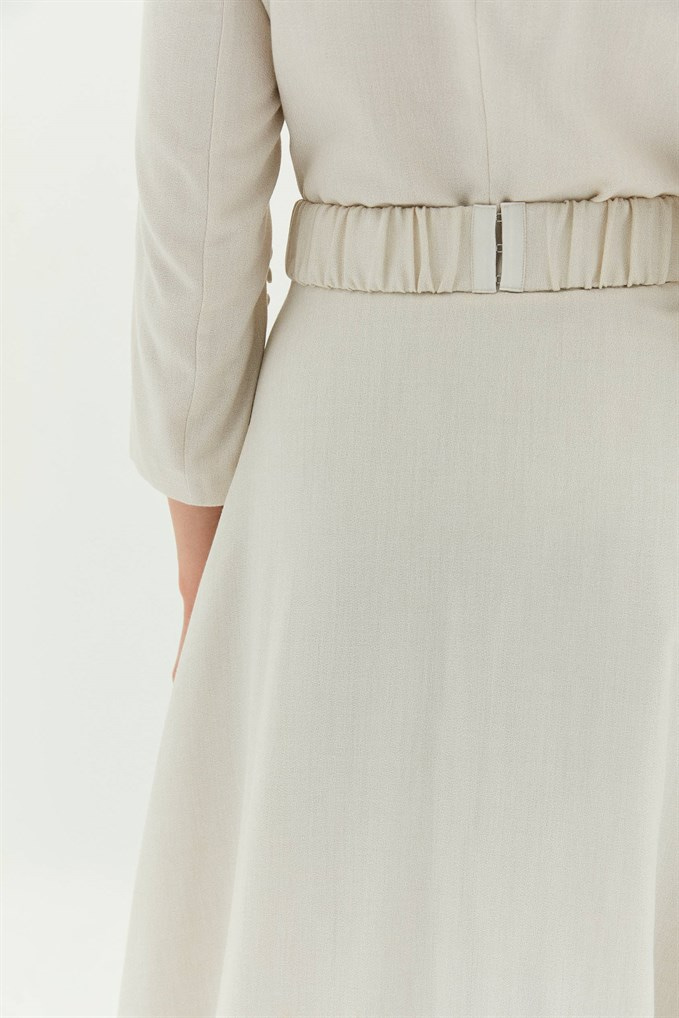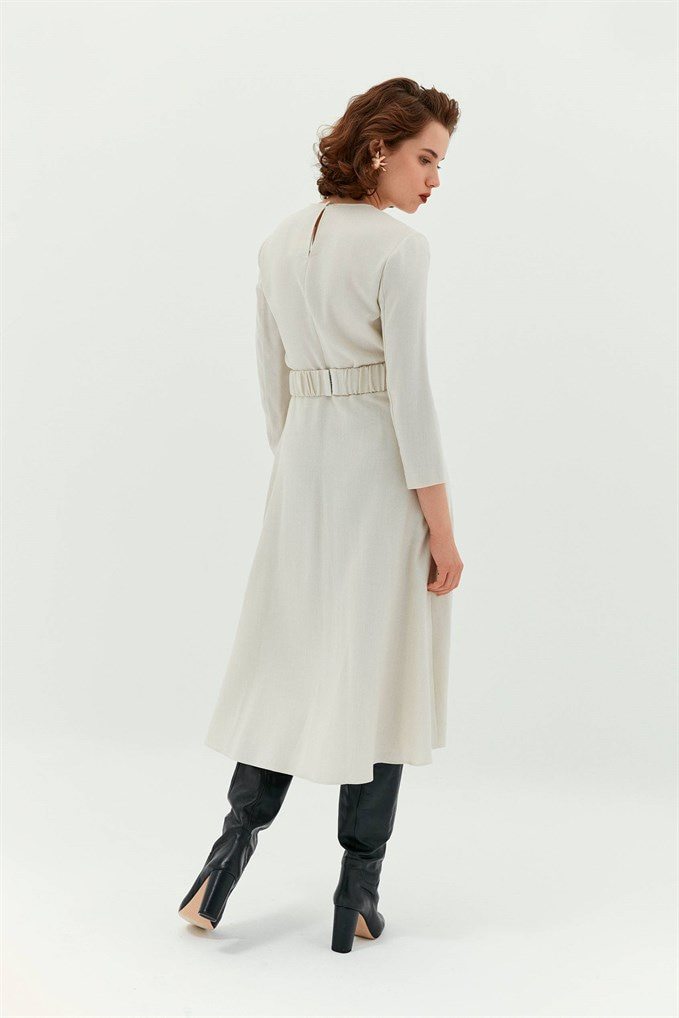 Ekru Asimetrik Kuşak Detaylı Midi Elbise (20690110_EKRU)