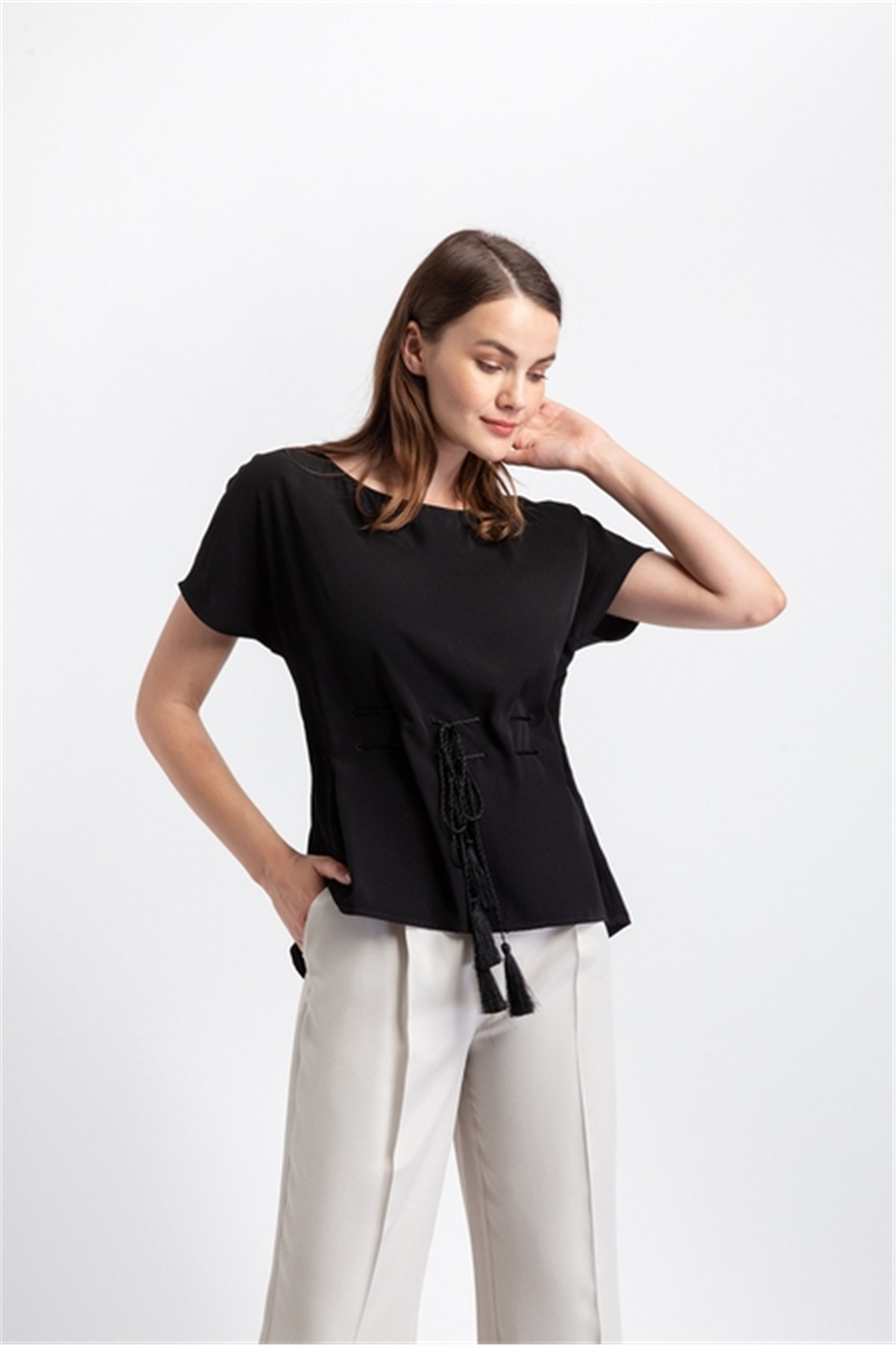 Beli Halat Detaylı Rahat Form Bluz Siyah (10990068_SIYAH)