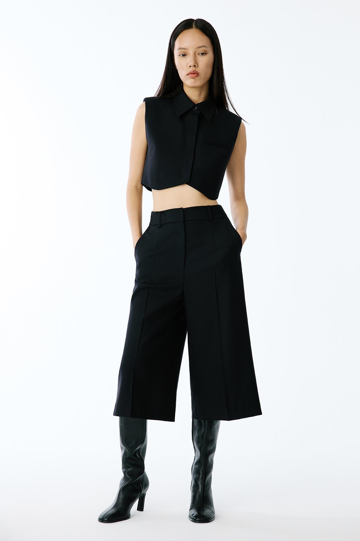 Bol Paça Yün Dokulu Siyah Kısa Pantolon (20125013_SIYAH)
