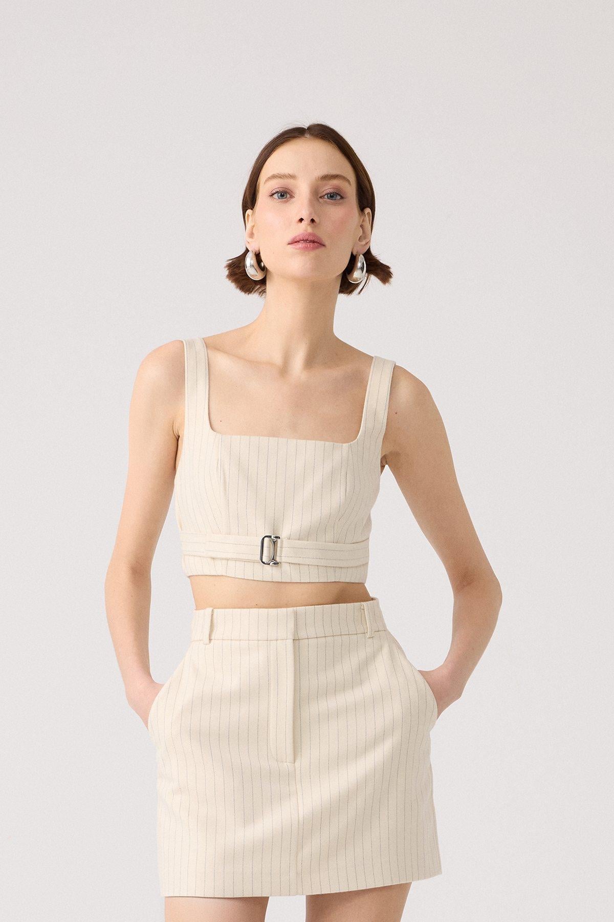 Çizgili Yün Dokulu Askılı Ekru Büstiyer (21424099_EKRU)