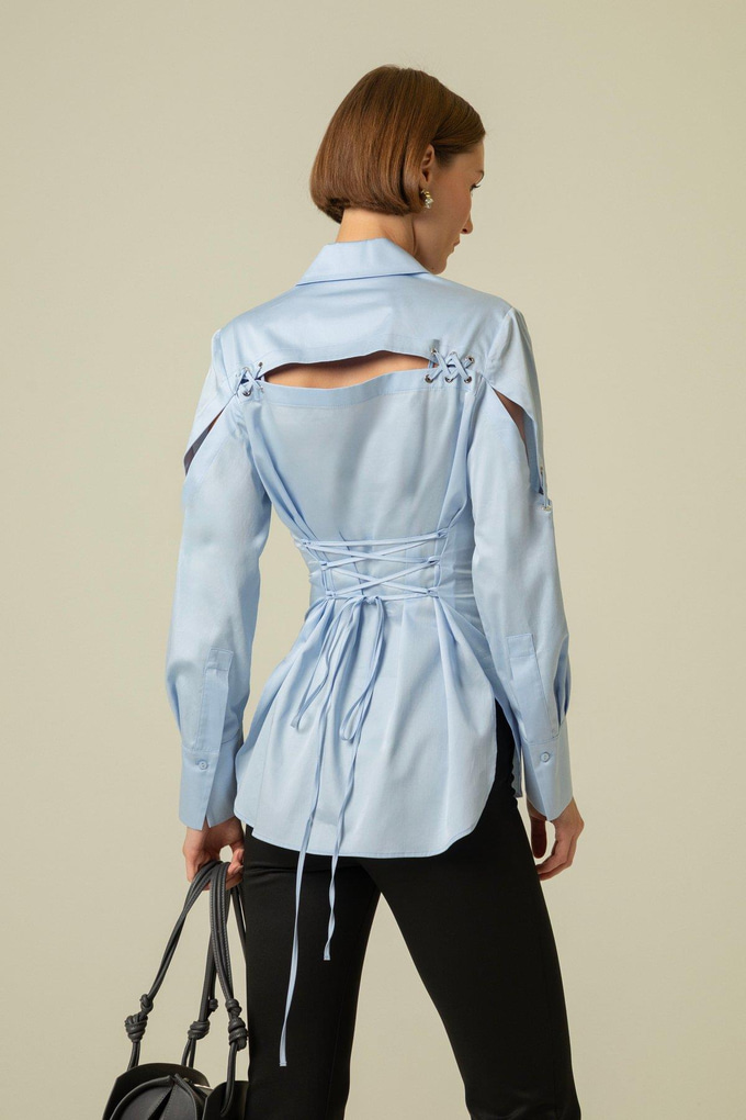 Sleeve Lace-Up Detail Blue Long Shirt