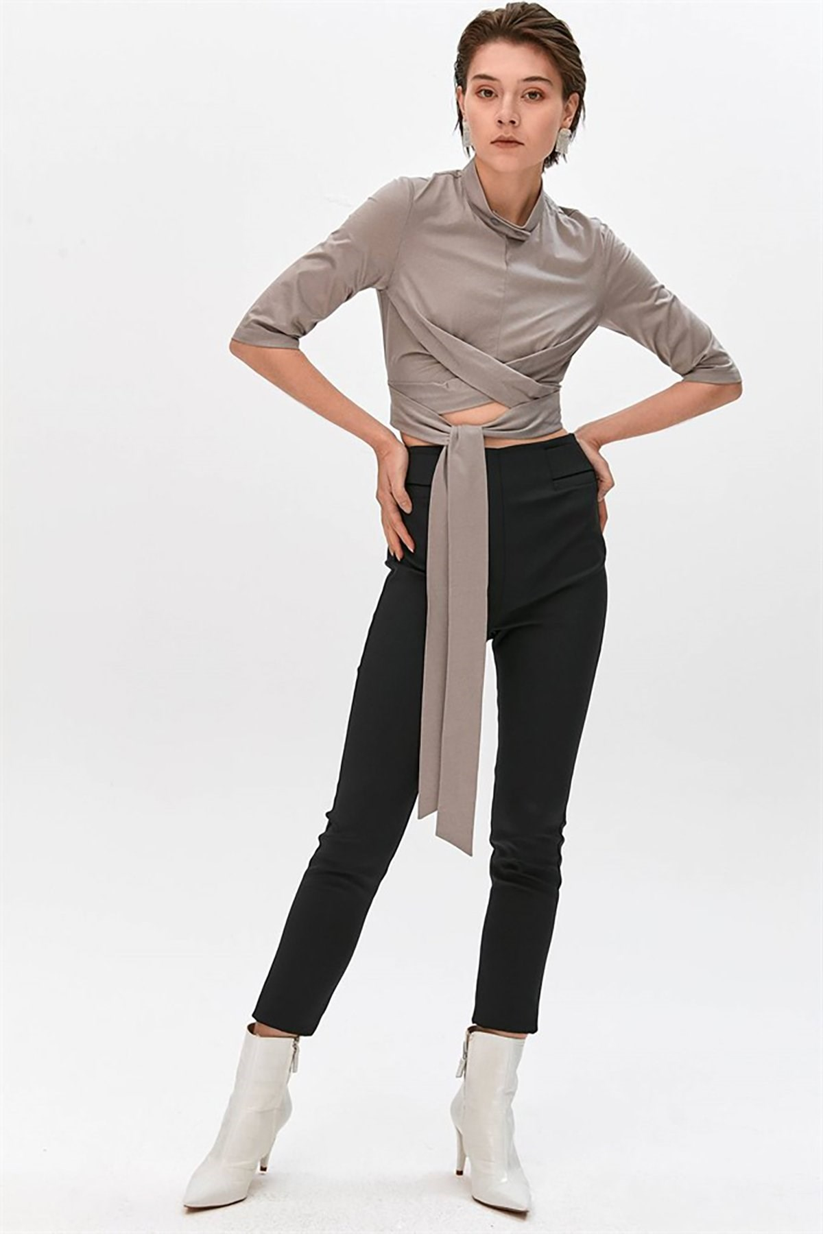 High Neck Blouse And With Fitted Sleeves Falling Below The Elbow. Featuring A Knot Detail On The Front And Wrap Around Waistband. Beden: %100 Cotton Garni: %35 Poliuretan %65 Pess.