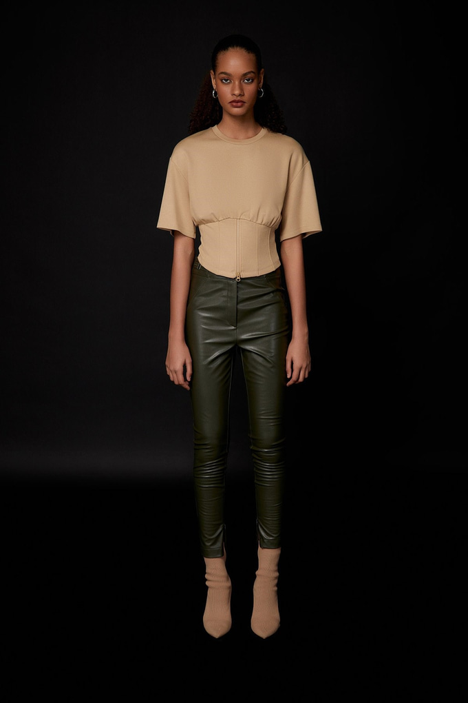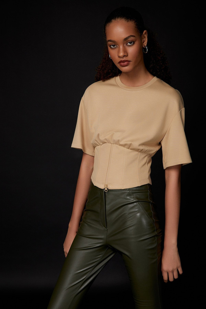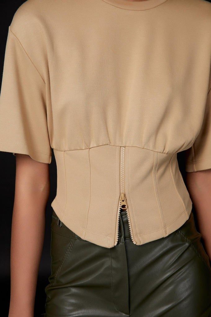 • Kısa Kollu Bisiklet Yaka Fermuar Detaylı Korse İlhamlı T-Shirt