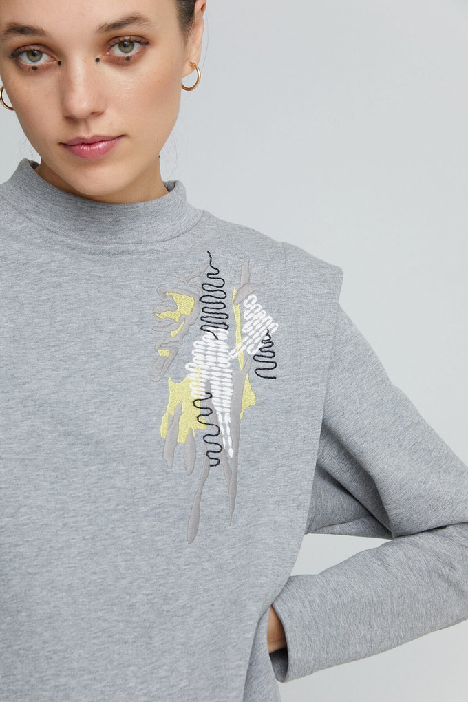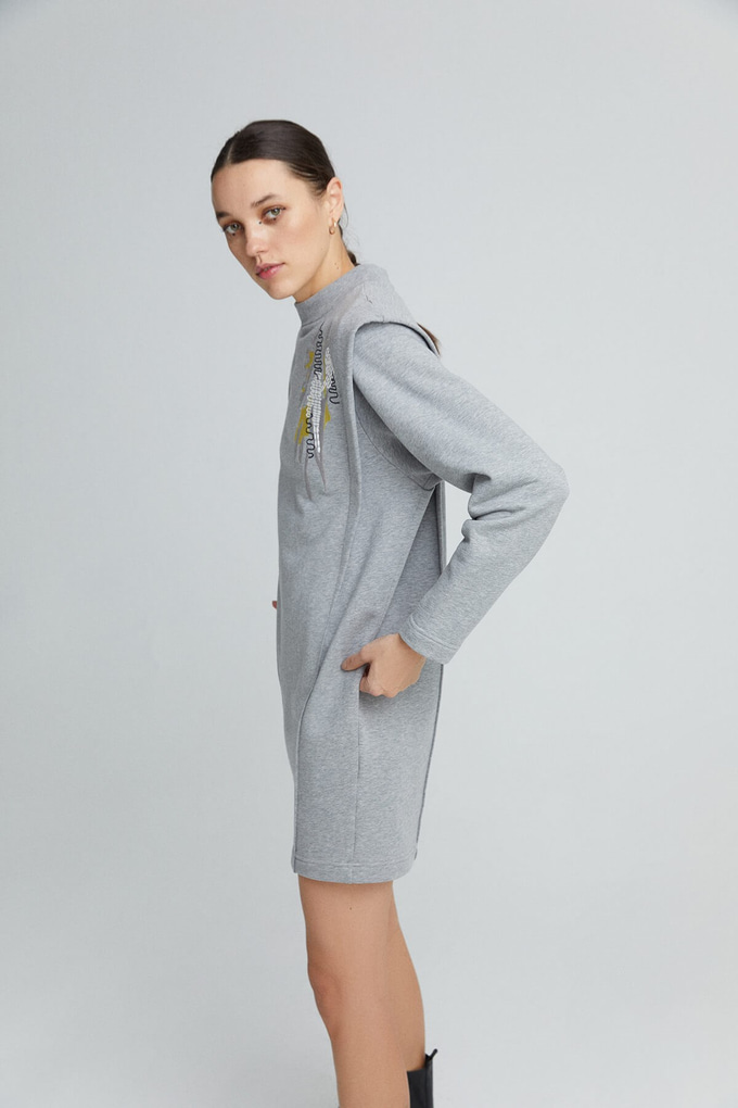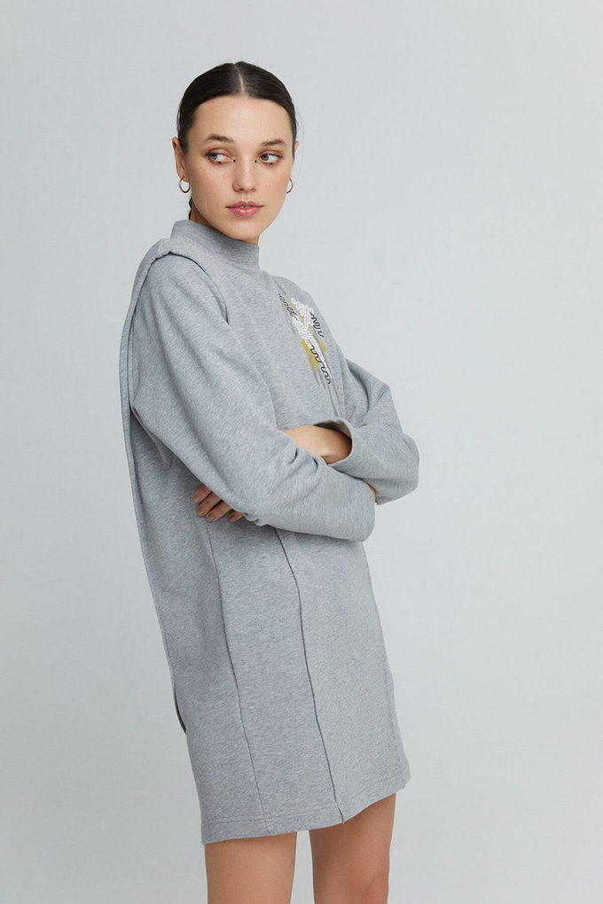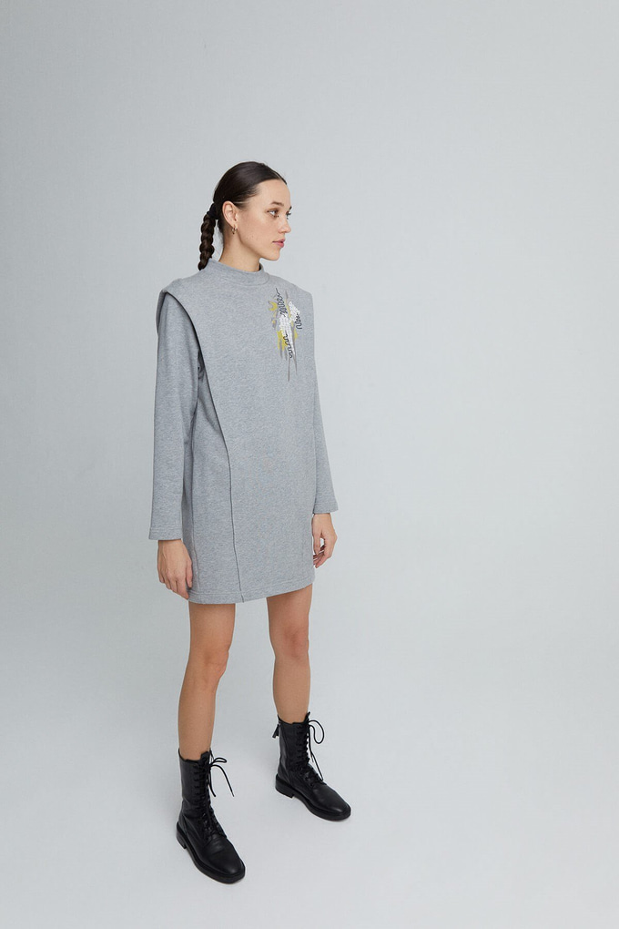 Mini, eşofman dokulu veya dalgıç kumaşlı elbiseler volan ve fırfır detaylarıyla fark yaratıyor. Gri mini sweat elbiseler sportif tarz benimseyenler için ideal. Bu gri mini sweat elbise, elbise 2 katmış izlenimi veren drapeli kol detayı, modeli renklendiren omzundaki soyut nakış detayı ve %100 pamuk sportif kumaşıyla rahatlık ve şıklığı bir arada sunuyor.