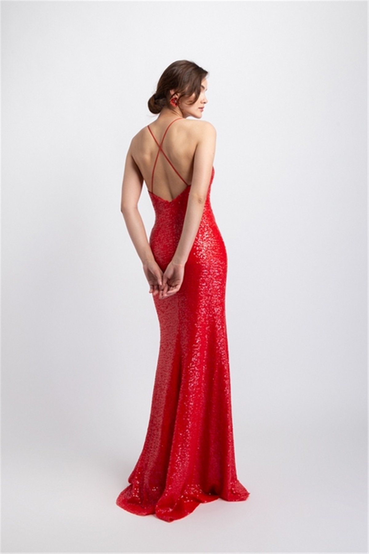 İnce Çapraz Askı, Payet Uzun Elbise Kırmızı (10690138_KIRMIZI)