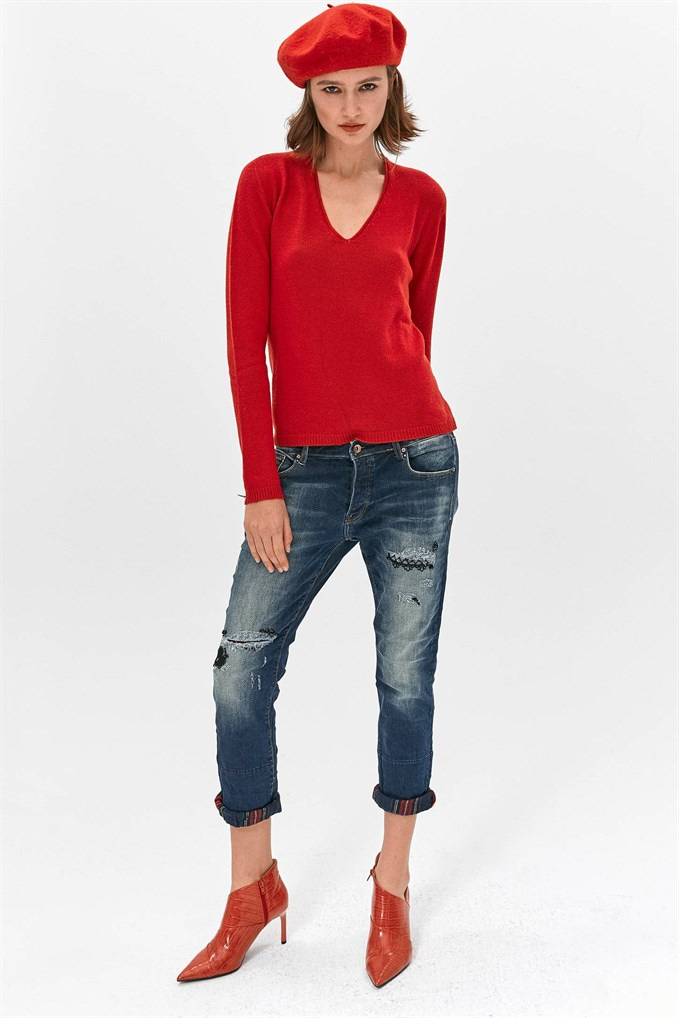 Beş cepli, orta bel yırtık skinny jean. Paçaları nakış detaylı. Önü fermuarlı ve metalik düğme iliklemeli. COTTON90%POLYESTER7%SPANDEX3% Model Bilgisi: Boy: 175 Göğüs: 85 Bel: 61 Kalça: 89 /36 beden