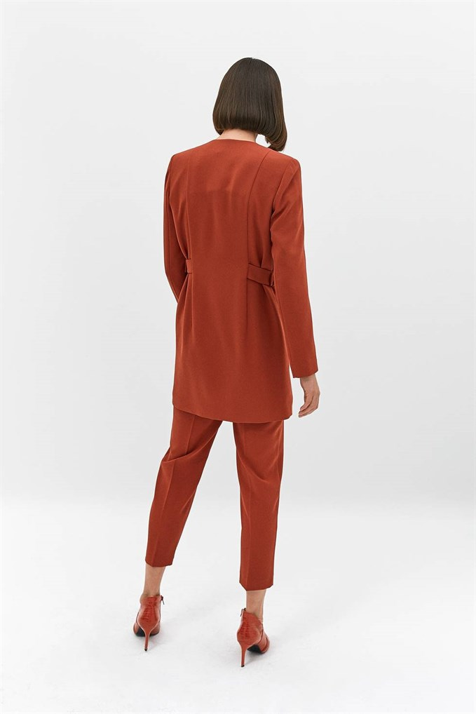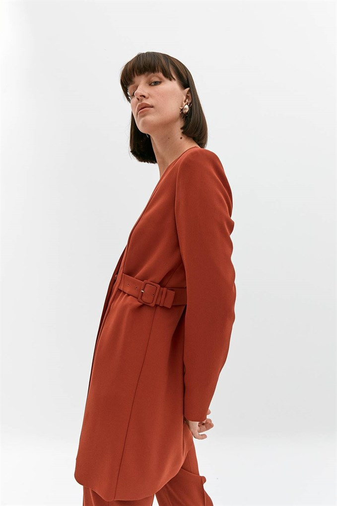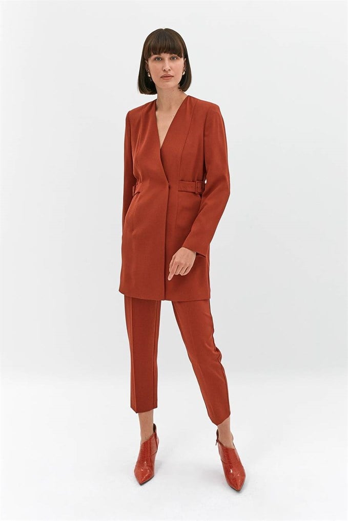 Kiremit kruvaze uzun ceketleri aynı renk pantolonlarıyla birlikte kullanarak iddialı bir şıklık yakalayabilirsiniz. Bu kiremit kruvaze uzun ceket, v yakalı uzun kruvaze modeli ve simetrik kuşak detayıyla kombinlerinize sade ve çabasız bir şıklık getiriyor.