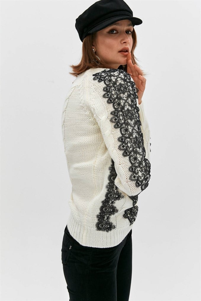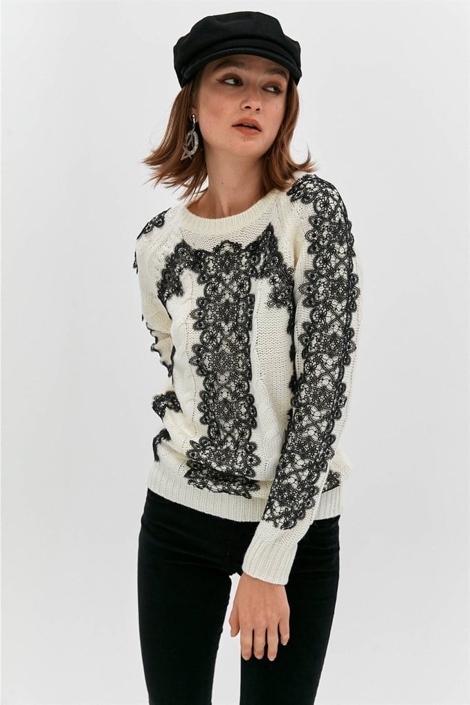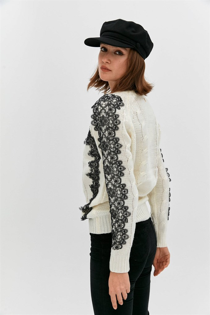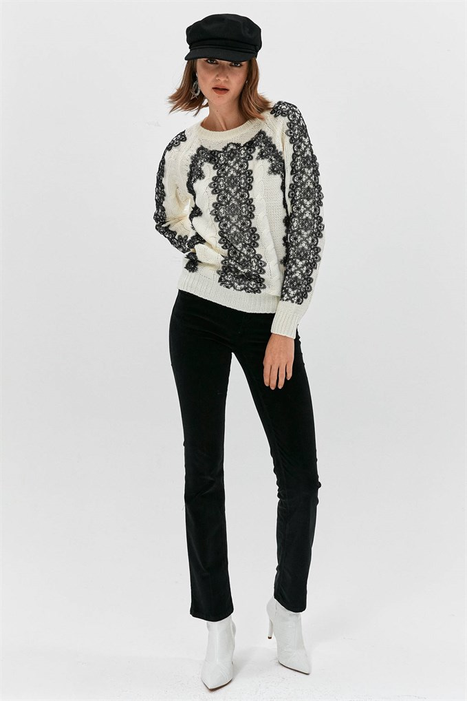 Creamsiyah Dantel Detaylı Kazak (FR19FP8032_CREAMBLACK)