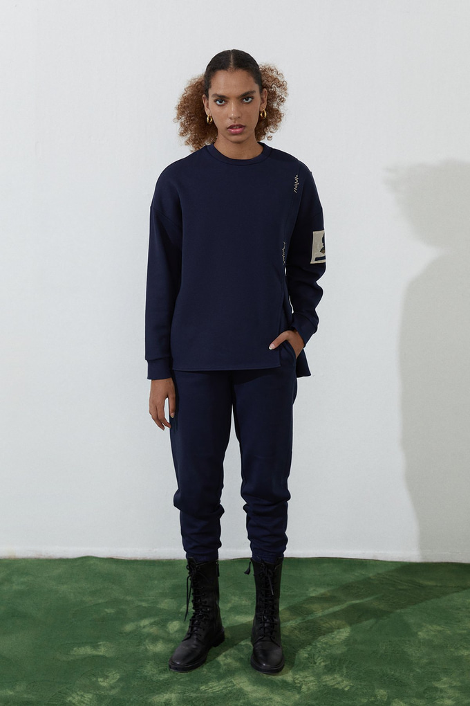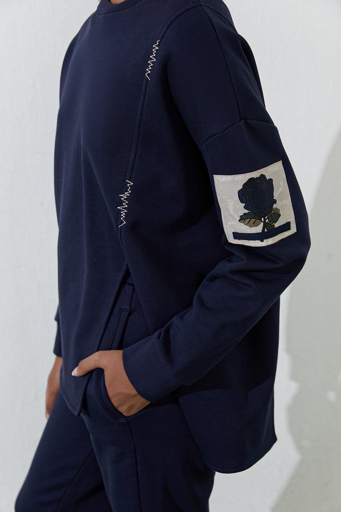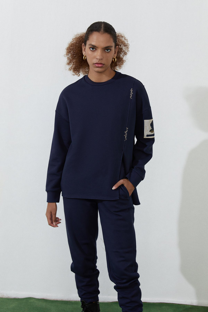 Lacivert asimetrik yırtmaçlı sweatshirtleri isterseniz takım sweatpant'lerle isterseniz diğer sportif parçalarla kombinleyebilirsiniz. Bu lacivert asimetrik yırtmaçlı sweatshirt, kolundaki figür detayı, ön ve arkasındaki asimetrik yırtmacı, ön tarafındaki dikiş detayı ve %100 pamuk kumaşıyla size sportif şıklığın en rahat halini vadediyor.
