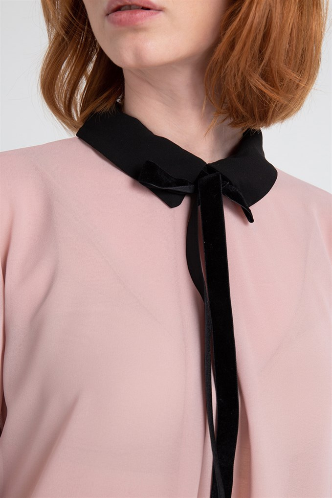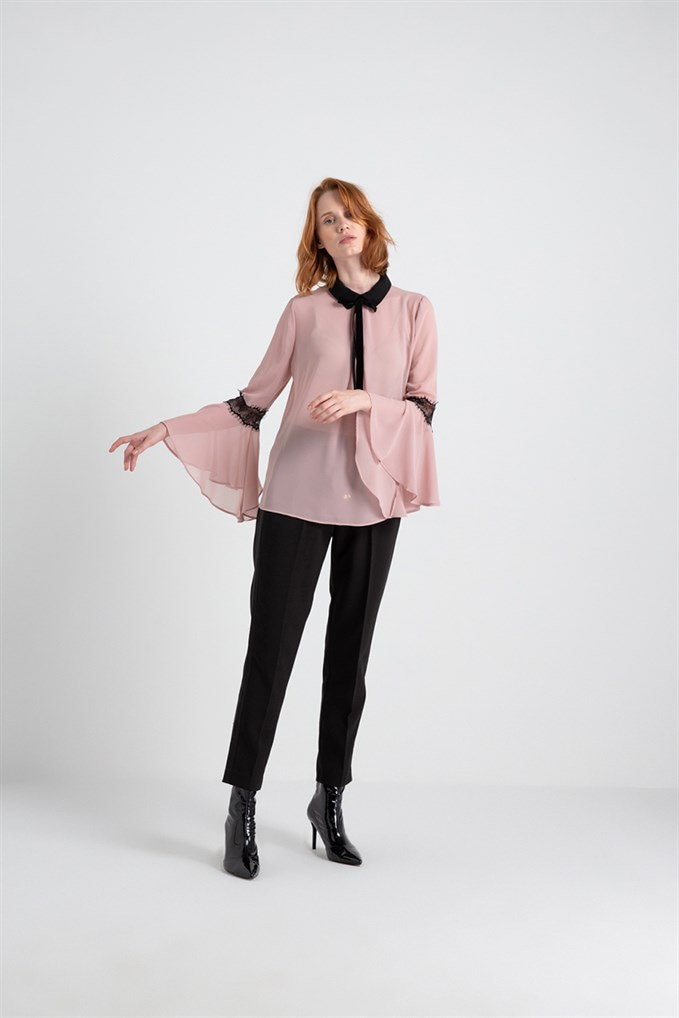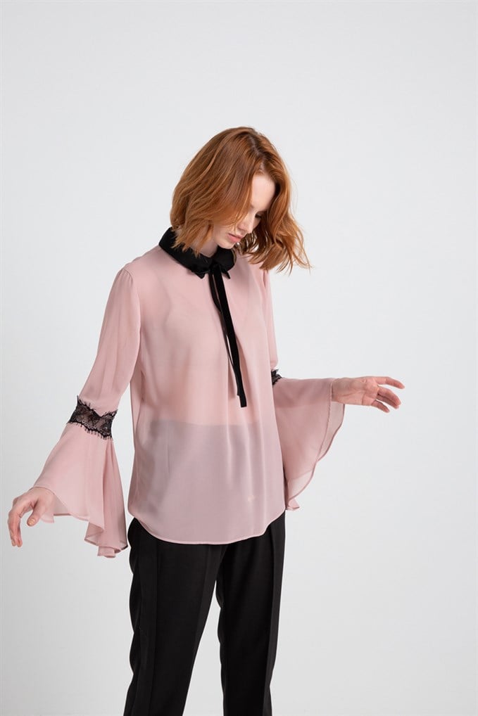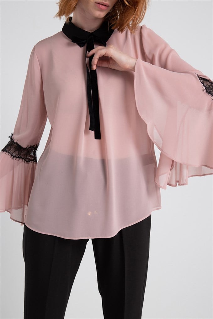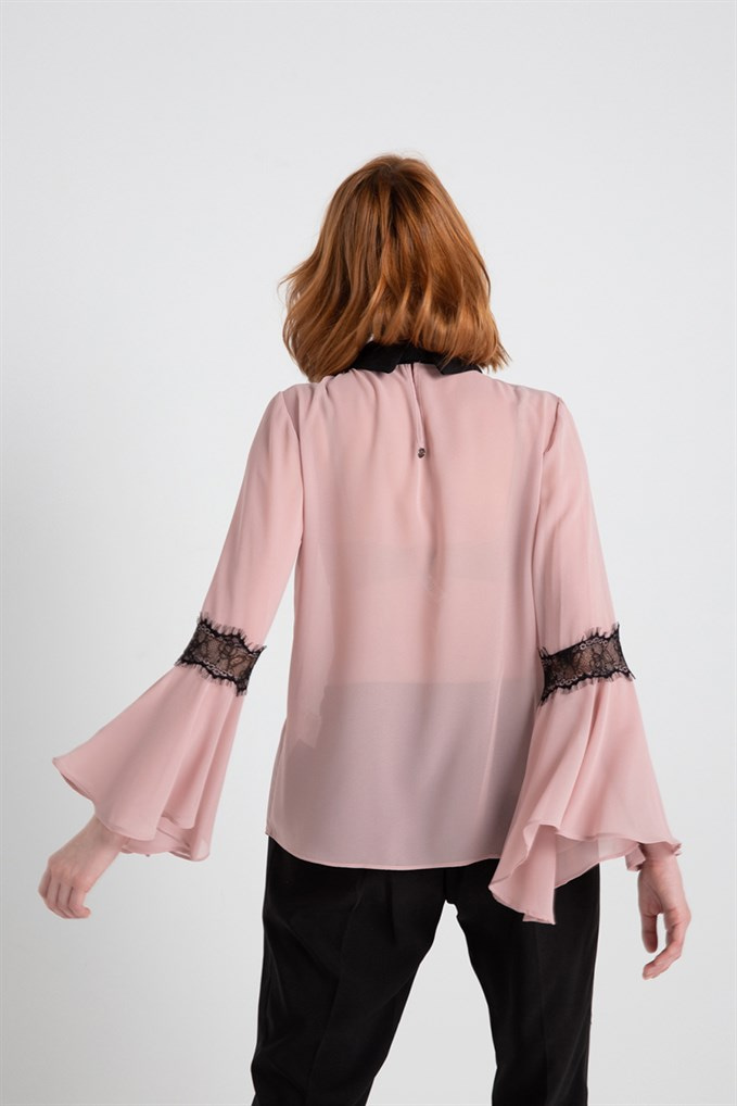 Dantel Garnili İspanyol Kol Pembe Siyah Şifon Bluz (XT18FW403_PINKBLACK)