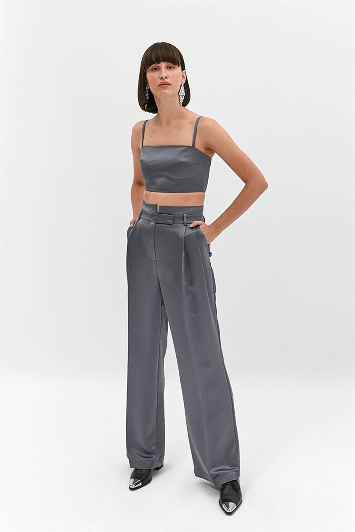 Gri Saten Pensli Crop Üst (21490127_GRI)