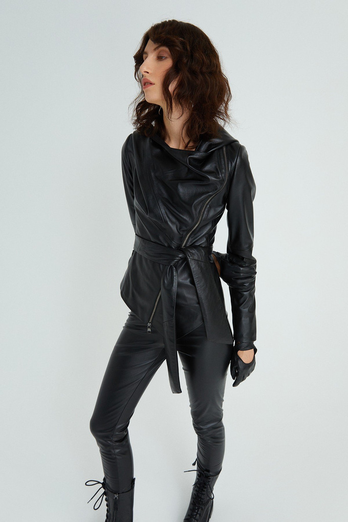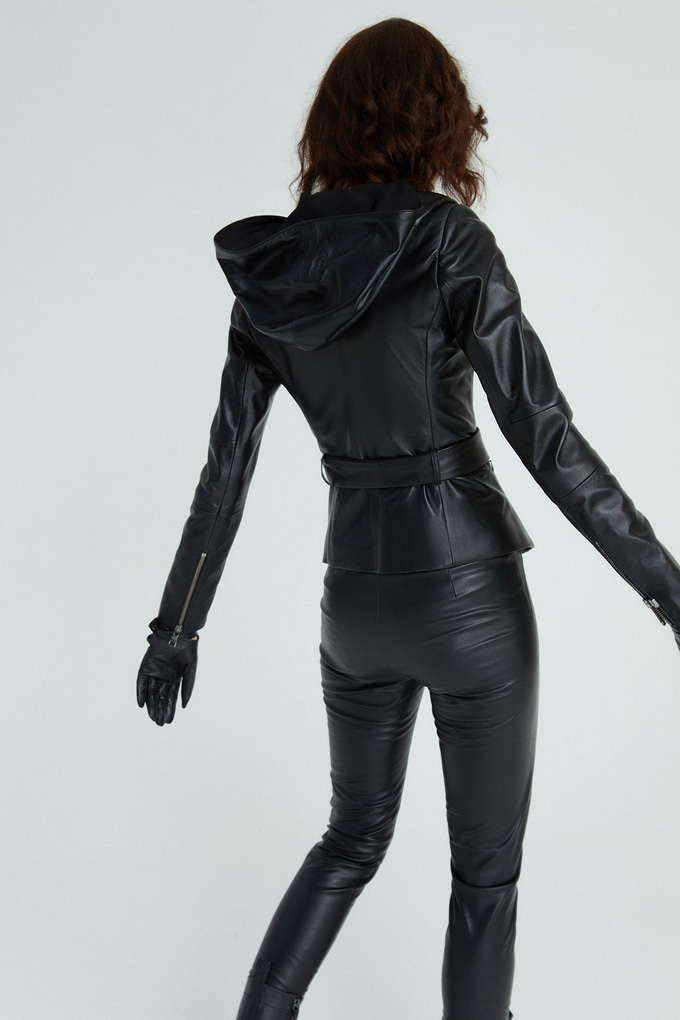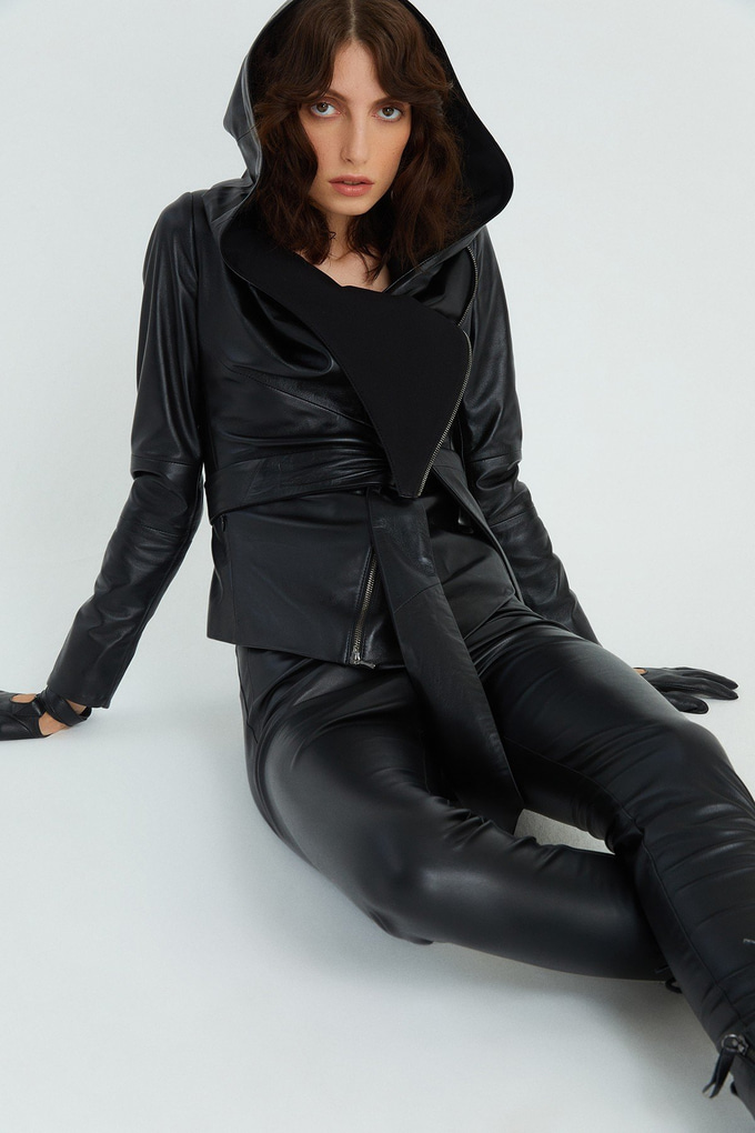 Siyah Asimetrik Fermuarlı Kapüşonlu Deri Ceket