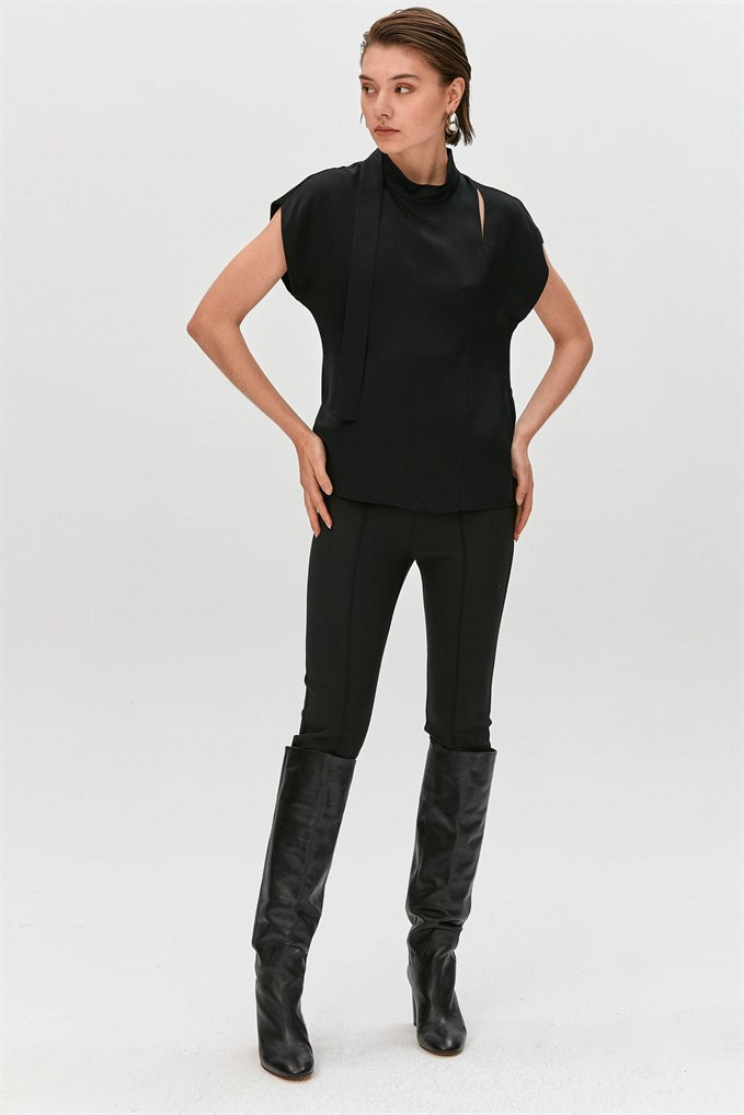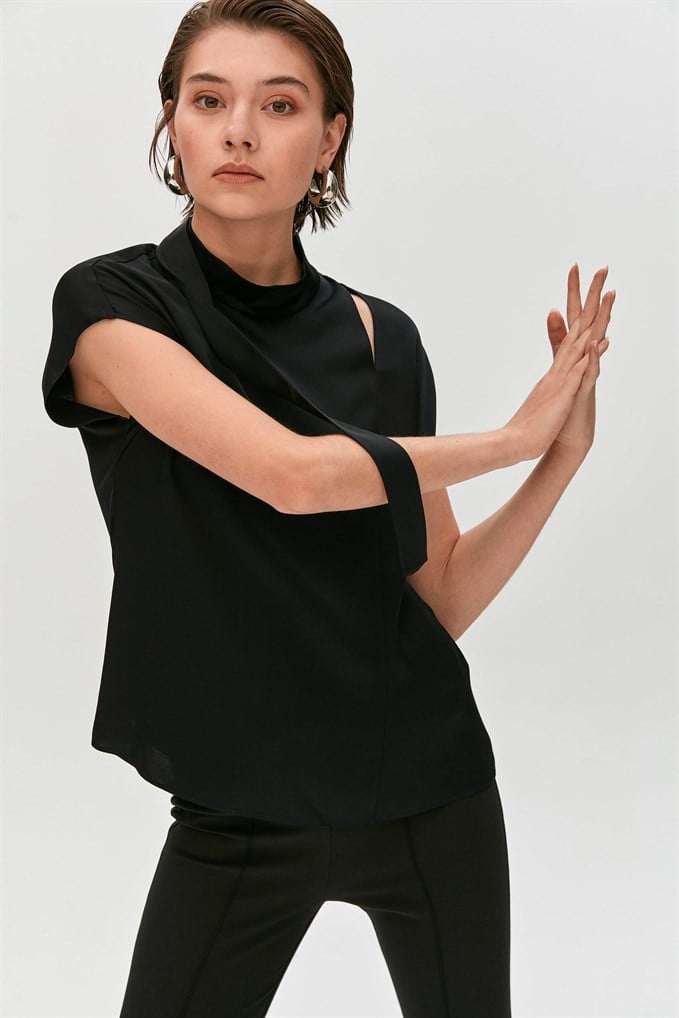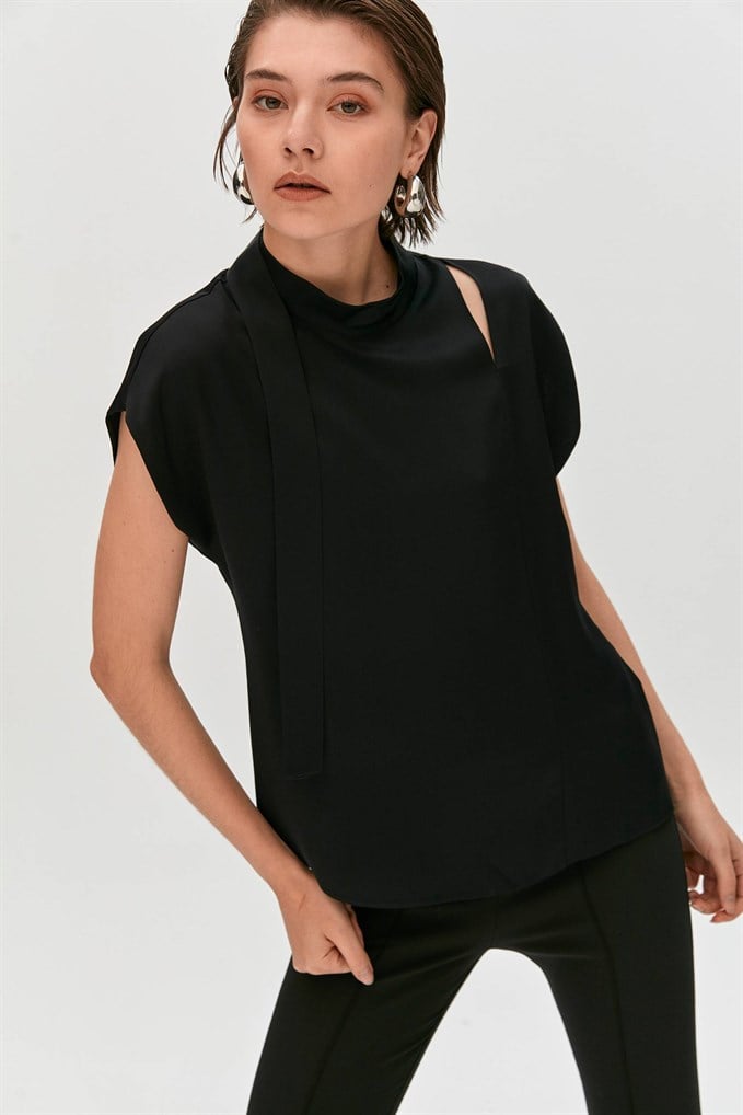 Siyah boynu kuşaklı kolsuz bluzlar, ister ofis ister günlük kombinlerinize eşlik edebilecek zarif yapıda bluzlardır. Bu siyah boynu kuşaklı kolsuz bluz, boynundaki zarif bağlama detayı, ön tarafındaki zarif pencere detayı, drapeli omuzları ve viskon karışımlı kumaşıyla zarafet ve konforu bir arada sunuyor.