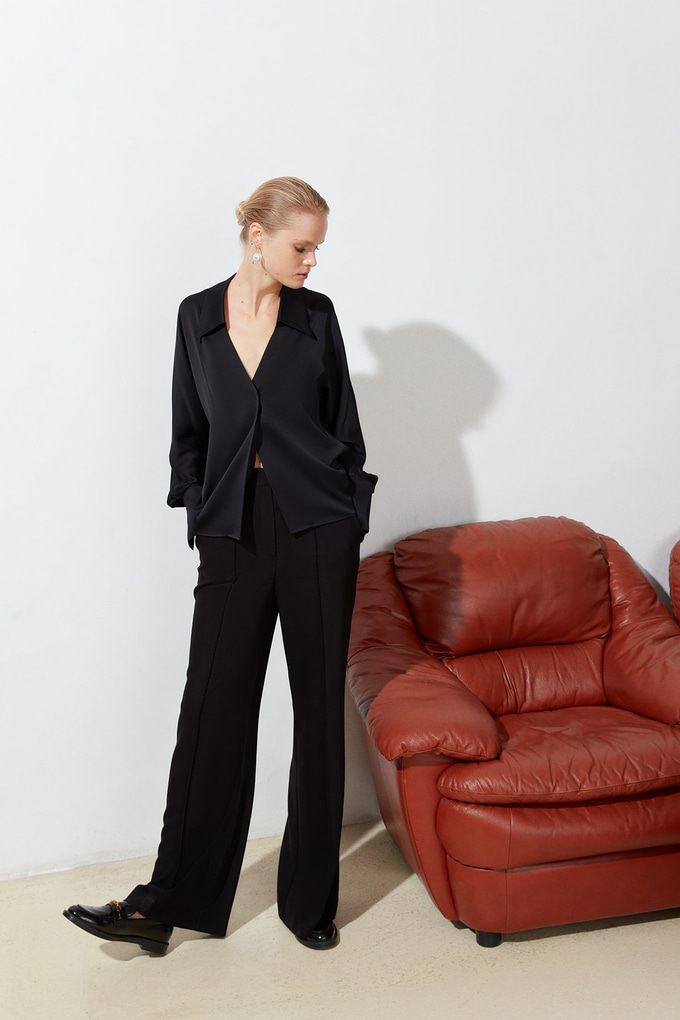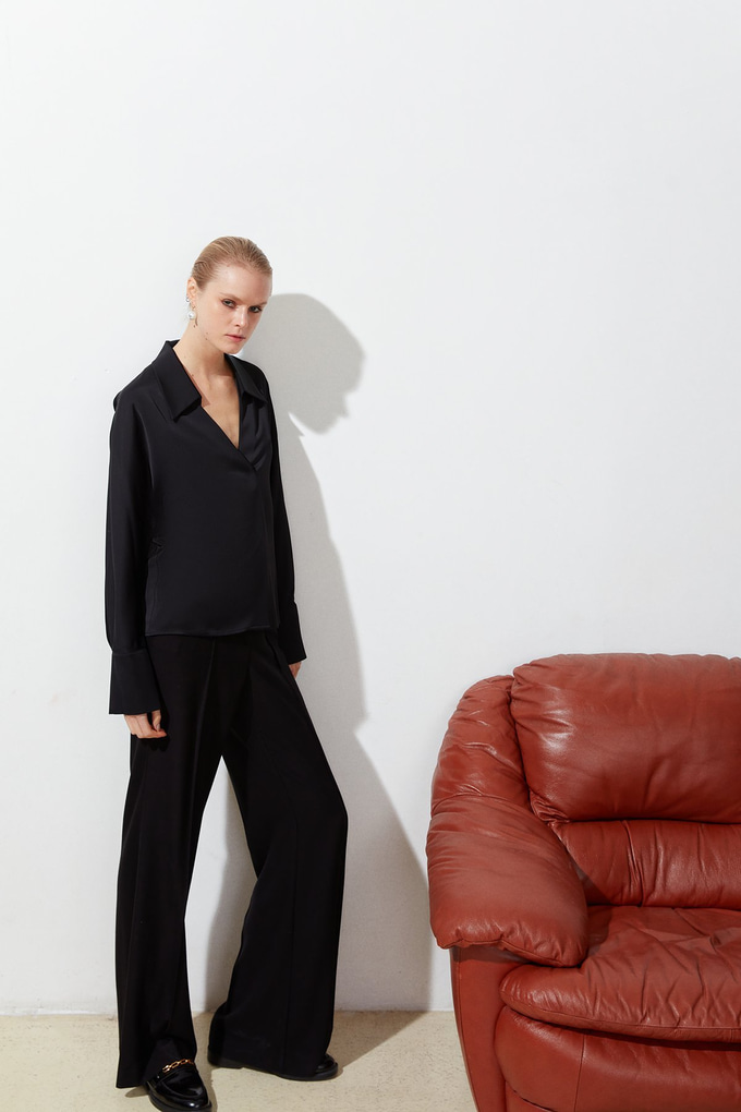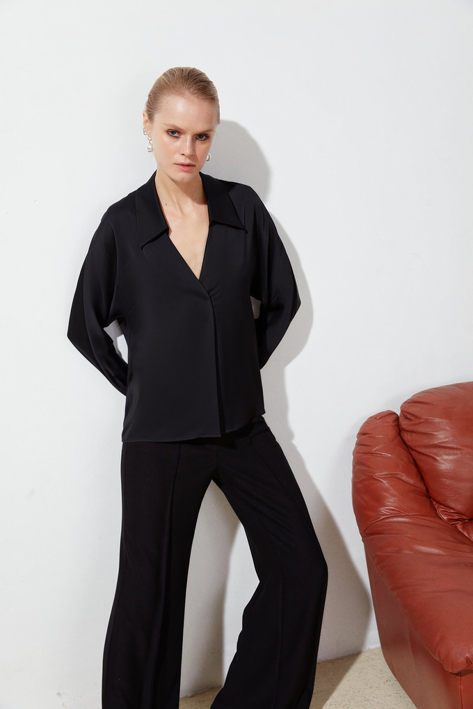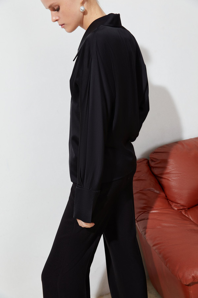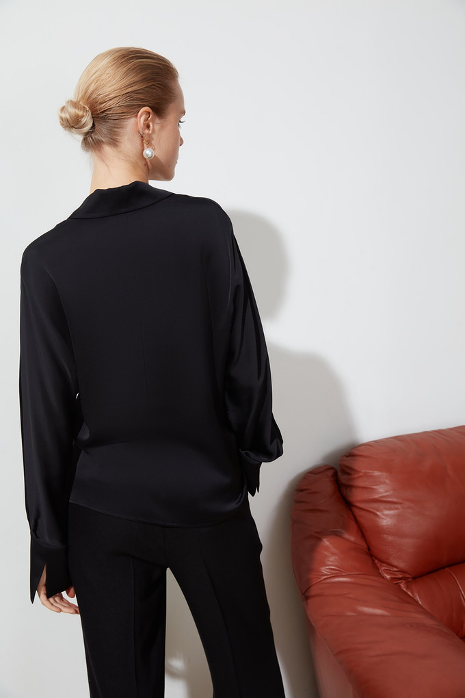 Siyah Yakalı Kruvaze Uzun Kollu Saten Gömlek (21121123_SIYAH)