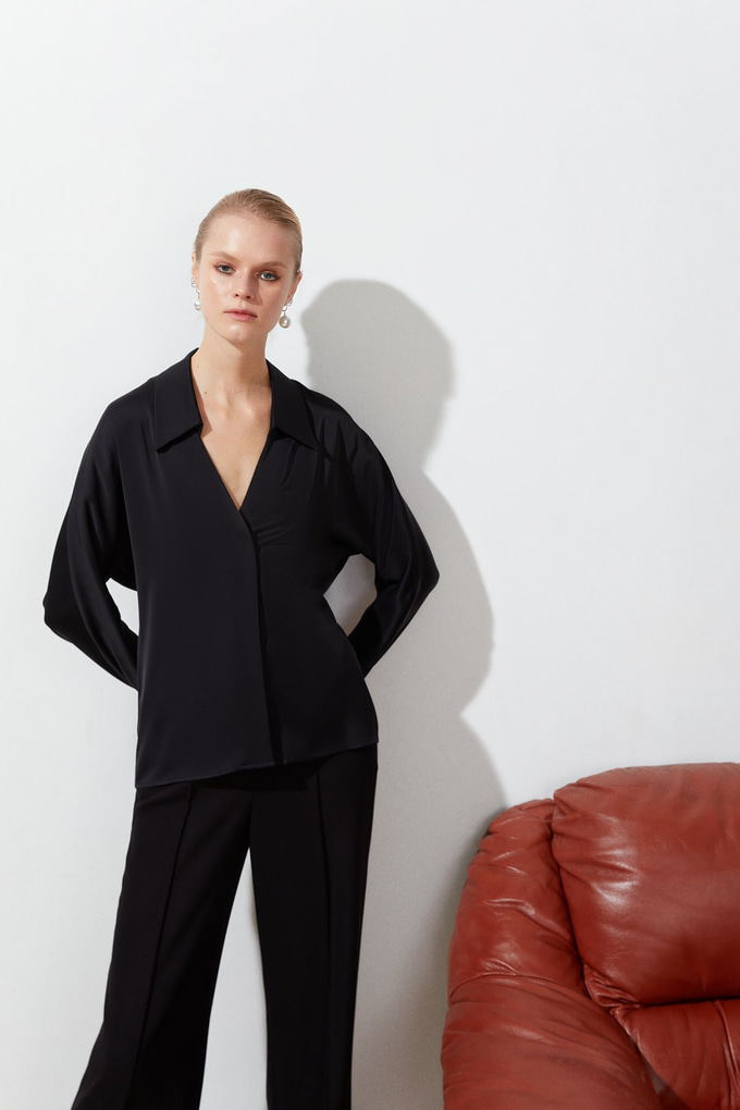 Siyah yakalı kruvaze uzun kollu saten gömlekler hem ofis şıklığı hem günlük tarzınızı tamamlamak için ideal. Bu siyah yakalı kruvaze uzun kollu saten gömlek, yakalı kruvaze modeli ve yumuşacık saten dokusuyla sizi feminen bir şıklığa davet ediyor.