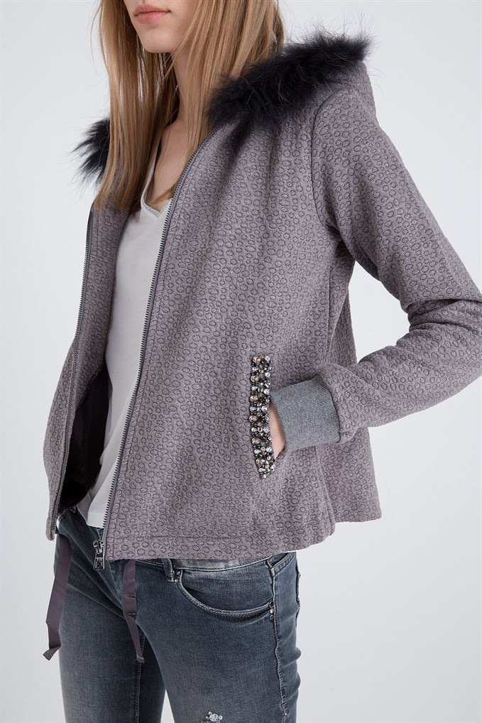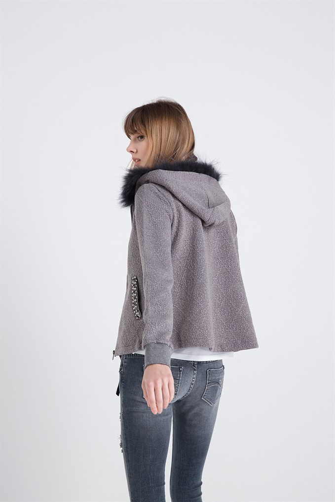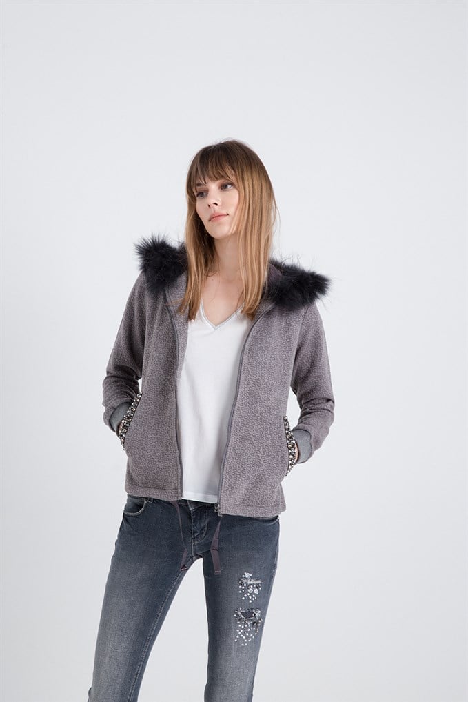 Taş Detaylı Kürklü Hırka Greymel