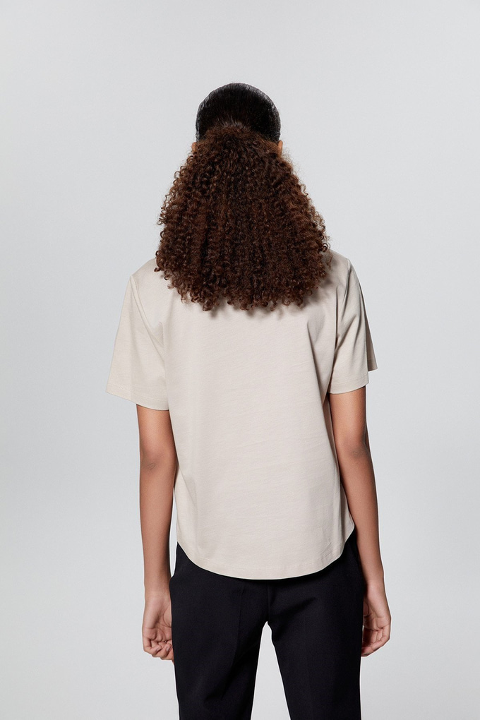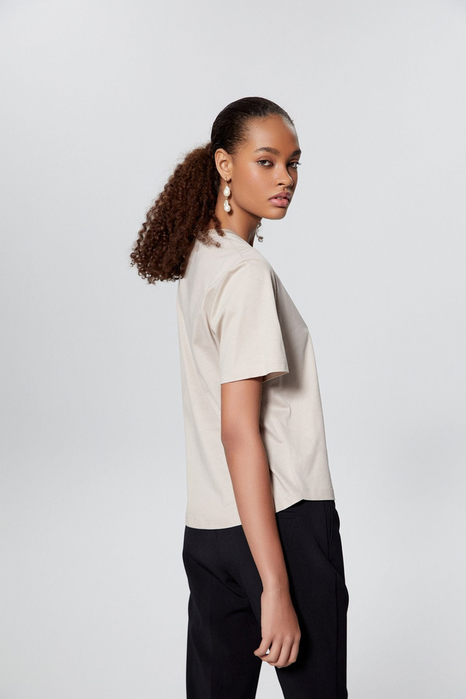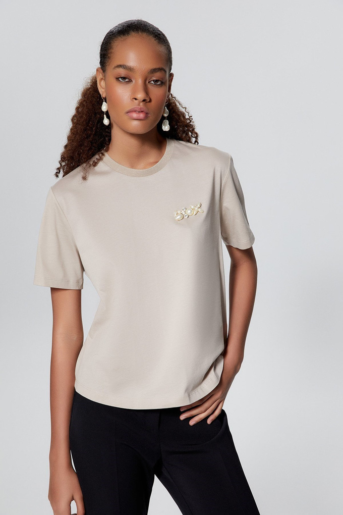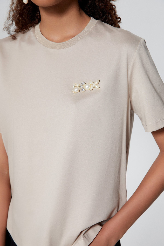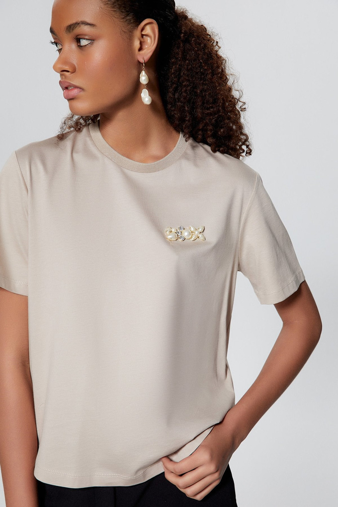 Vizon renk, kısa kollu, bisiklet yaka, taş detaylı t-shirt. Eğer basic parçalarda bile stil dokunuşu arayanlardansanız bu t-shirtler tam size göre.