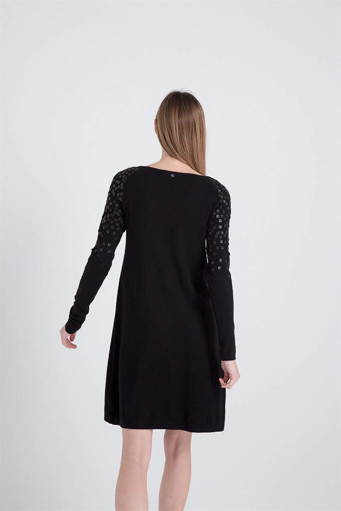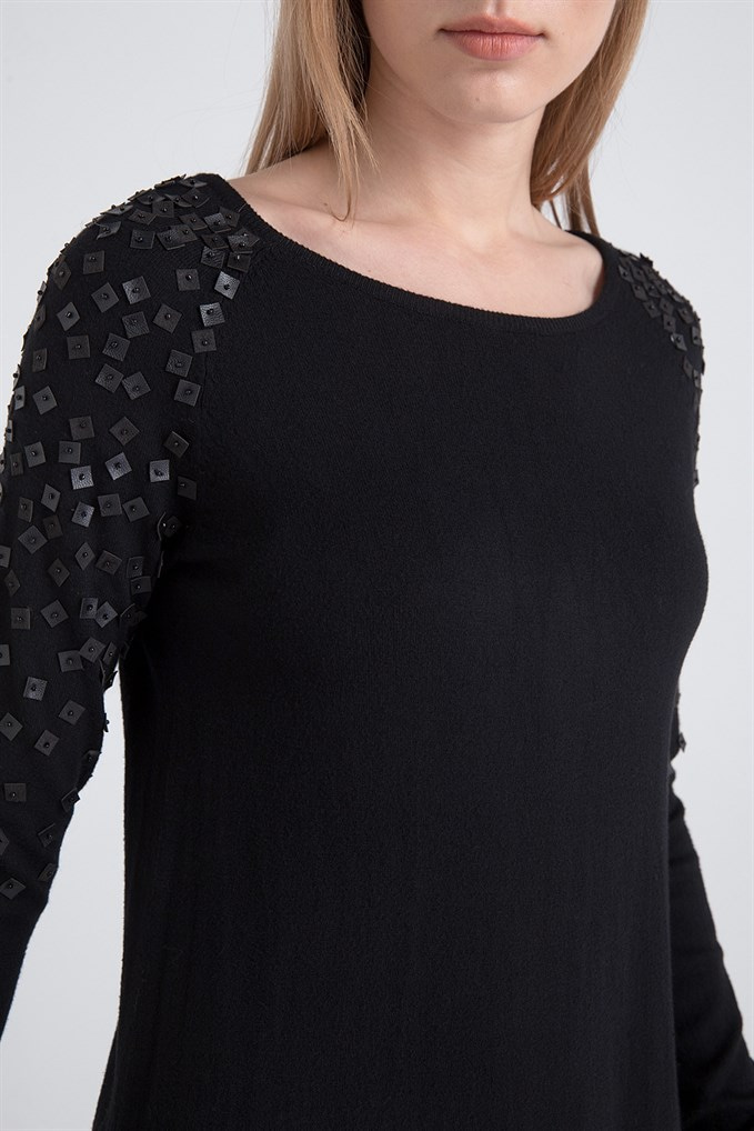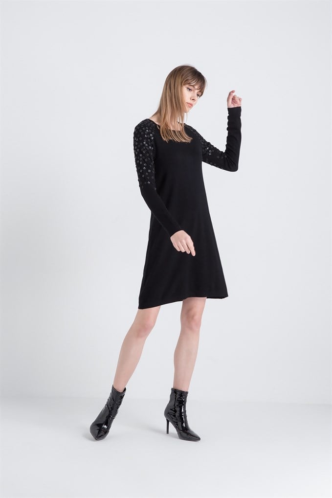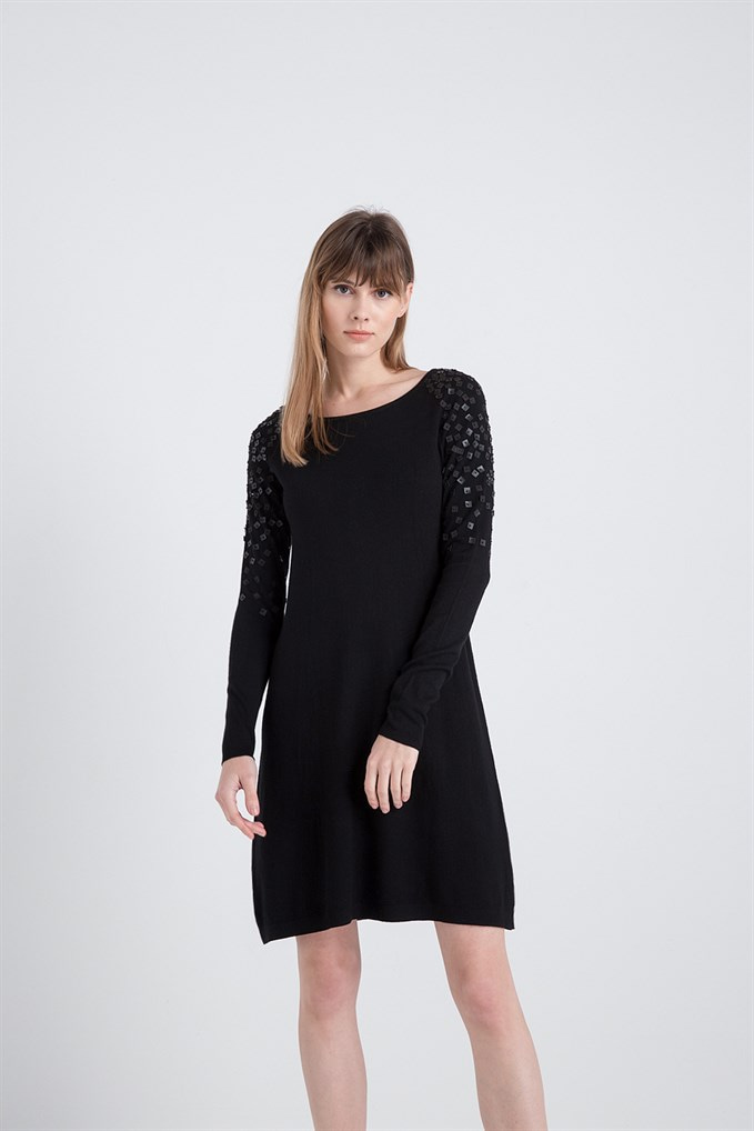 Omuzları Deri Elişi Detaylı Siyah Triko Elbise (XT18FW851_BLACK)