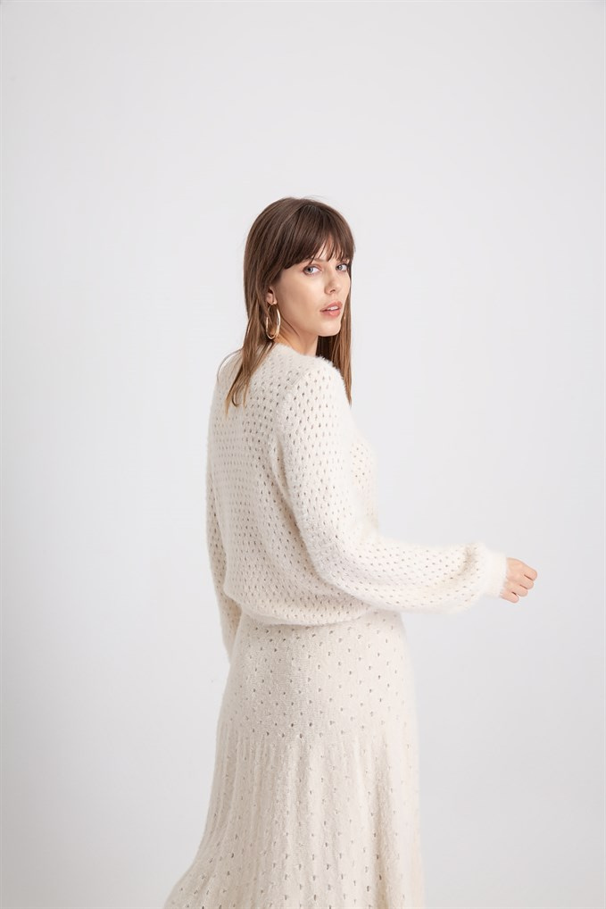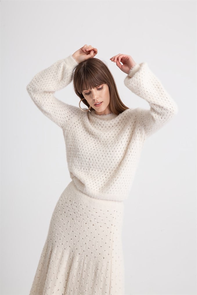 Tüylü İp, Ajurlu Triko Kazak Ekru