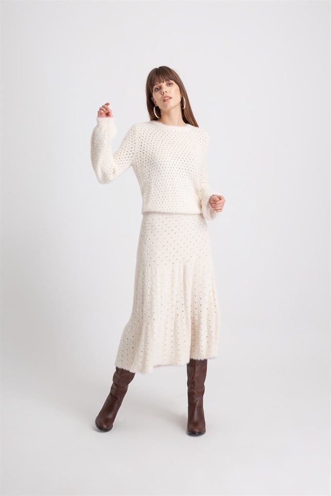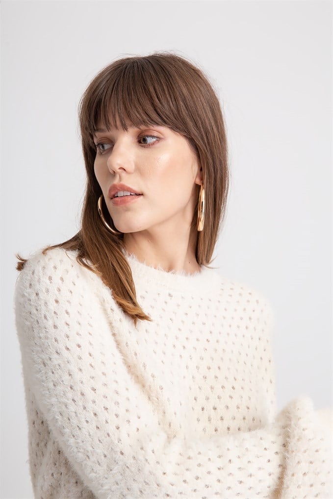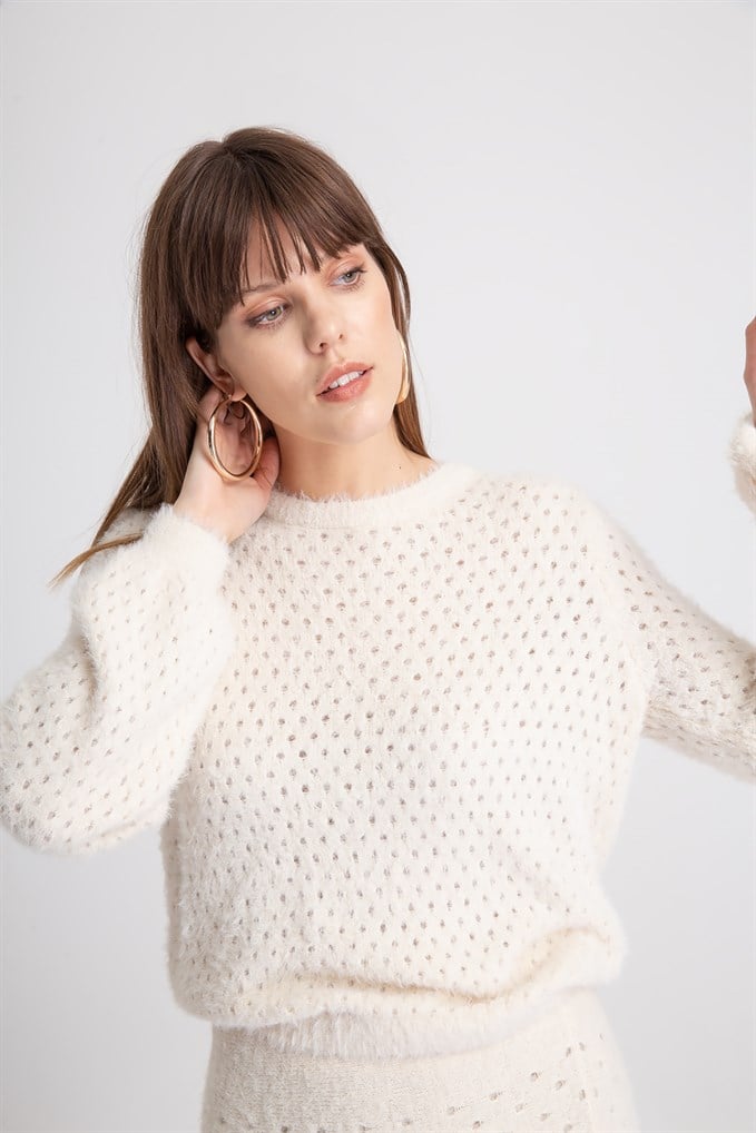 Tüylü İp, Ajurlu Triko Kazak Ekru (20780139_EKRU)