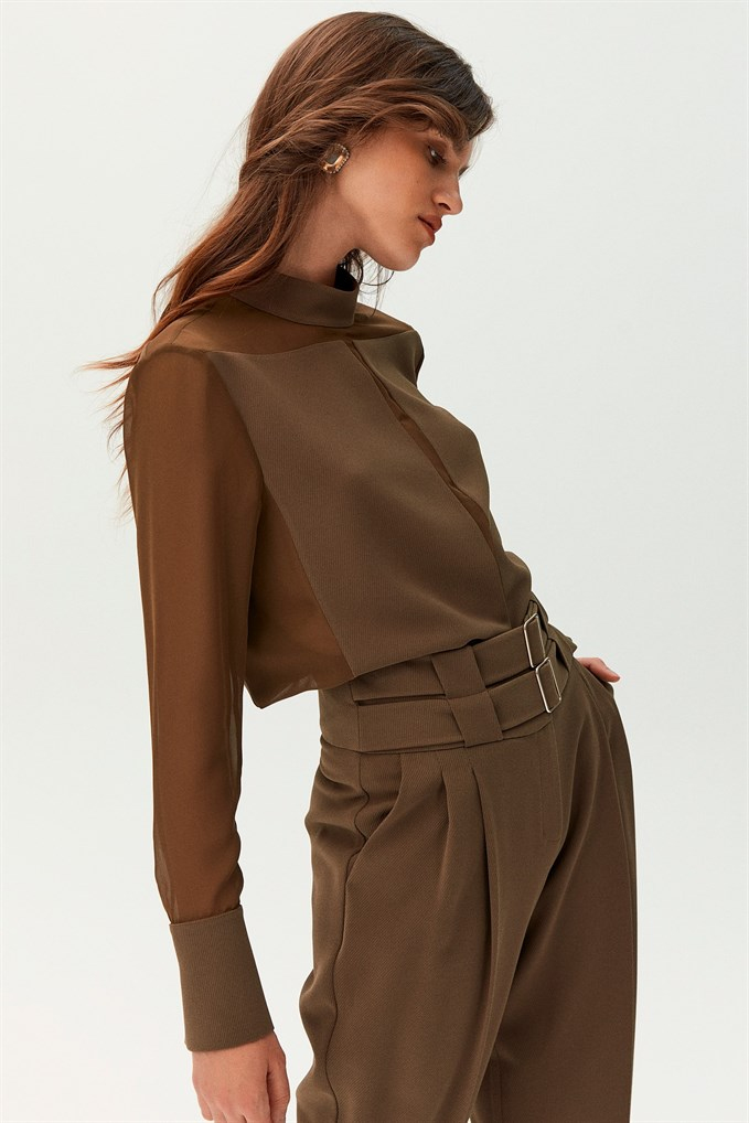 Haki Yarı Transparan Detaylı Dik Yaka Bluz